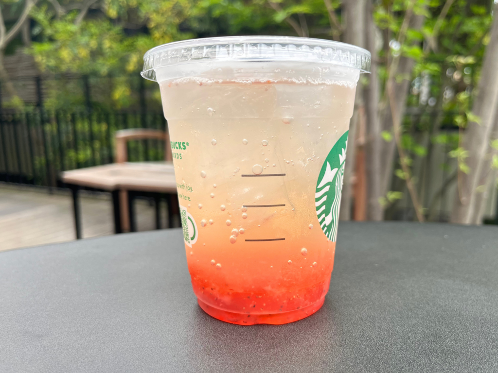 こちらが本日発売された「チラックス ソーダ ストロベリー」。TallサイズとGrandeサイズ、2サイズの展開です。こちらはTallサイズ。店内利用で590円(税込)でした。
