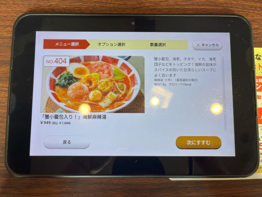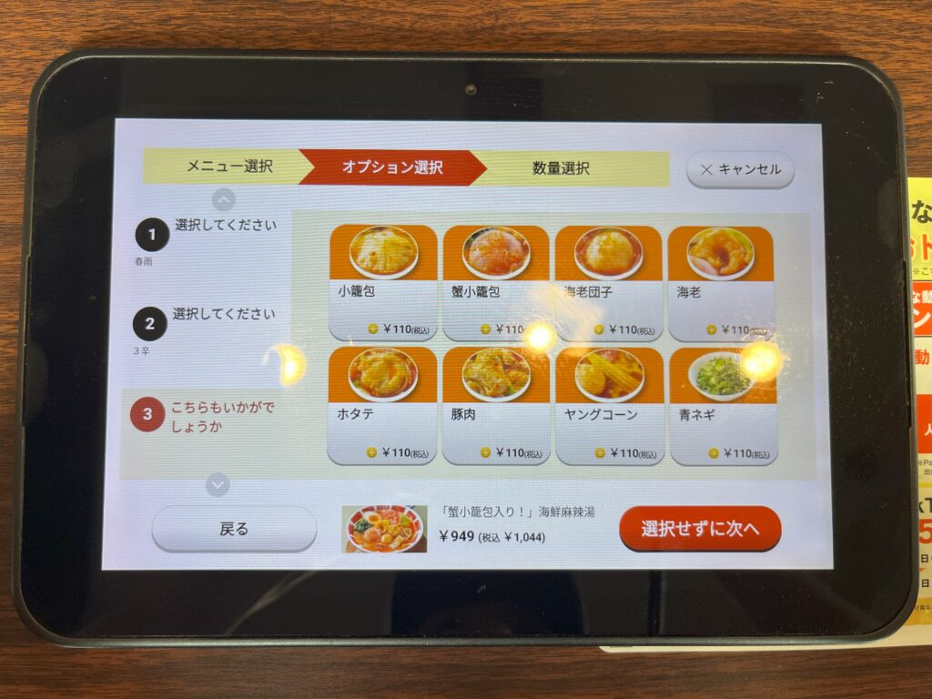 注文はタブレットで行います。今回は「蟹小籠包入り!海鮮麻辣湯」(税込1,044円)を注文。