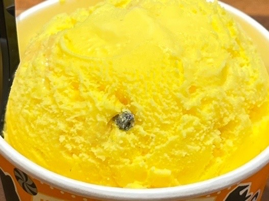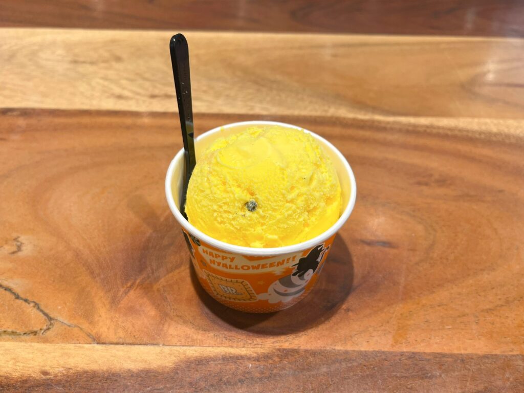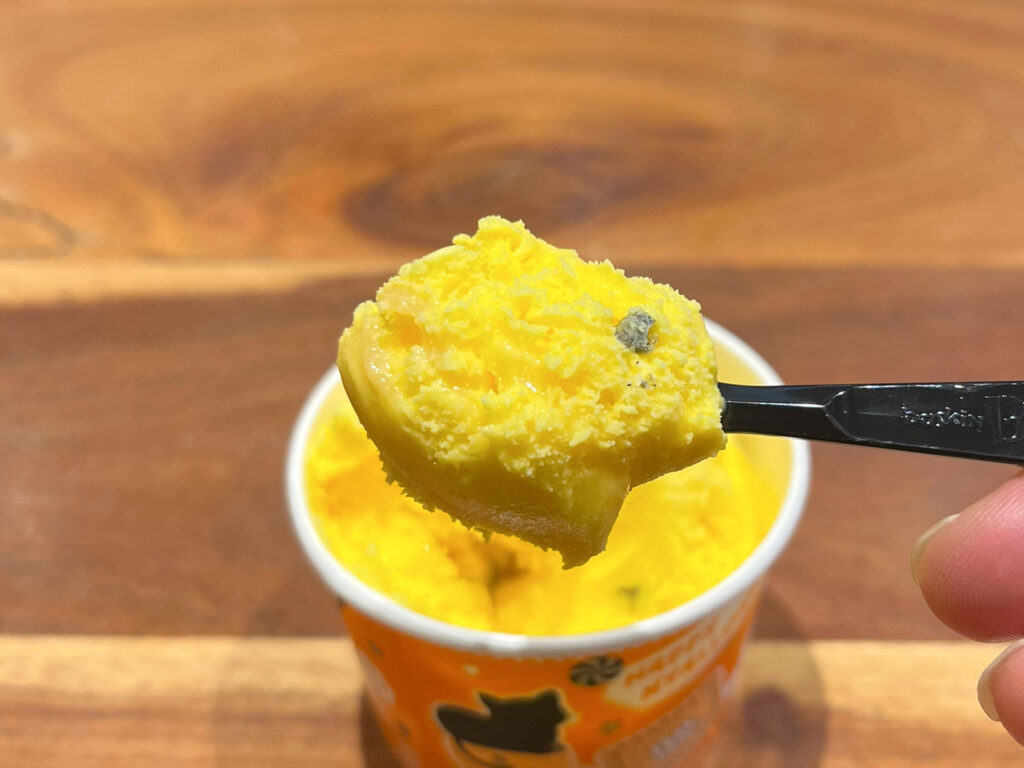 満月を彷彿とさせるアイスに、ネコちゃんの足跡をイメージした黒ゴマのクリスプが入っています。まさにハロウィンカラー!