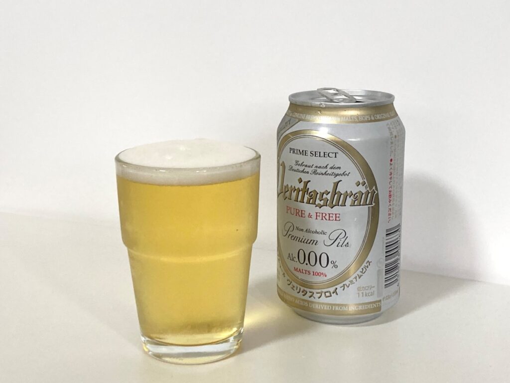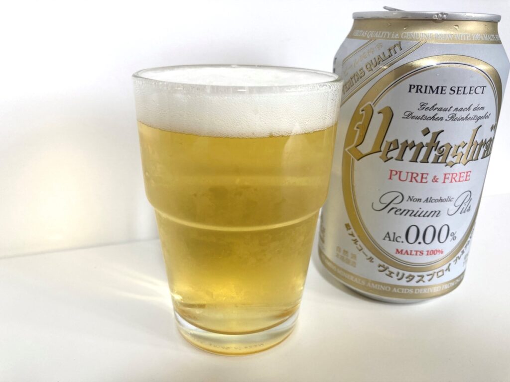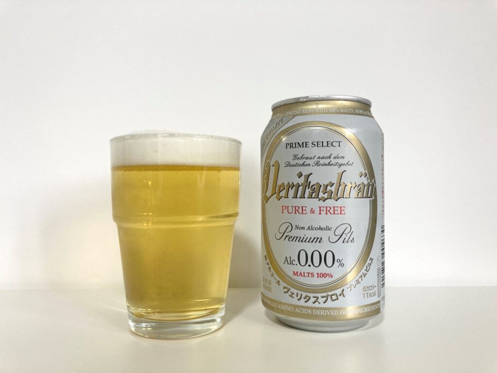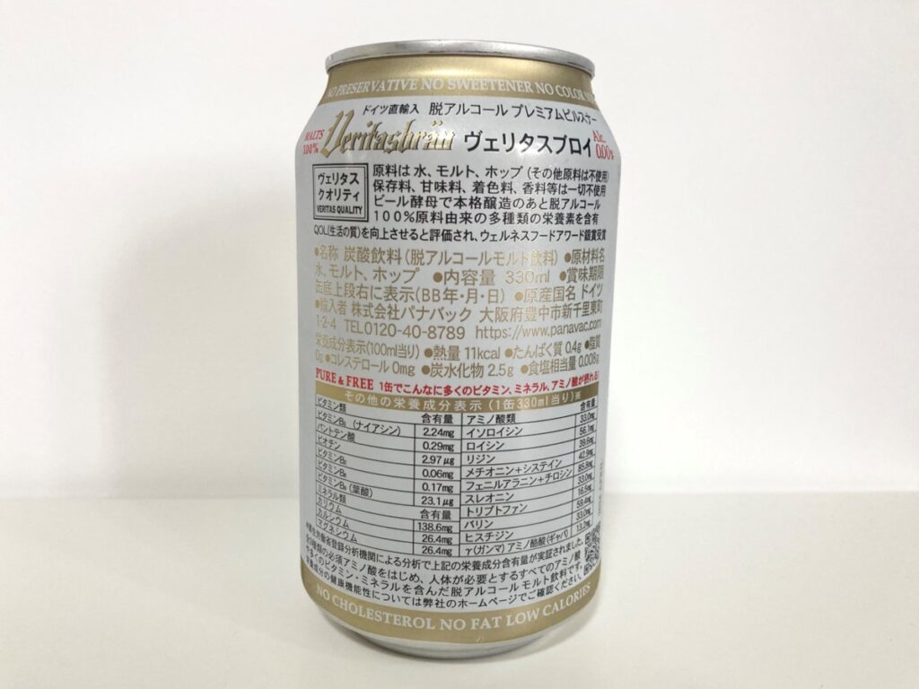 こちらが『ヴェリタスブロイ』(缶330ml)。今回は成城石井で購入しました。100ml当たりのエネルギーは11kcalと低カロリーで、原材料は水・モルト・ホップの3つだけ。保存料、甘味料、着色料などの添加物は一切不使用です。