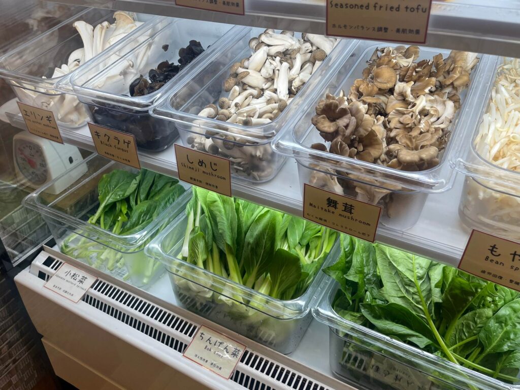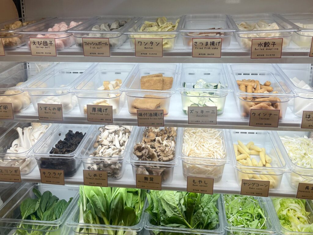 葉物は新鮮なものが数種類並び、はんぺんや餃子など、たくさんの具材が並べられています。