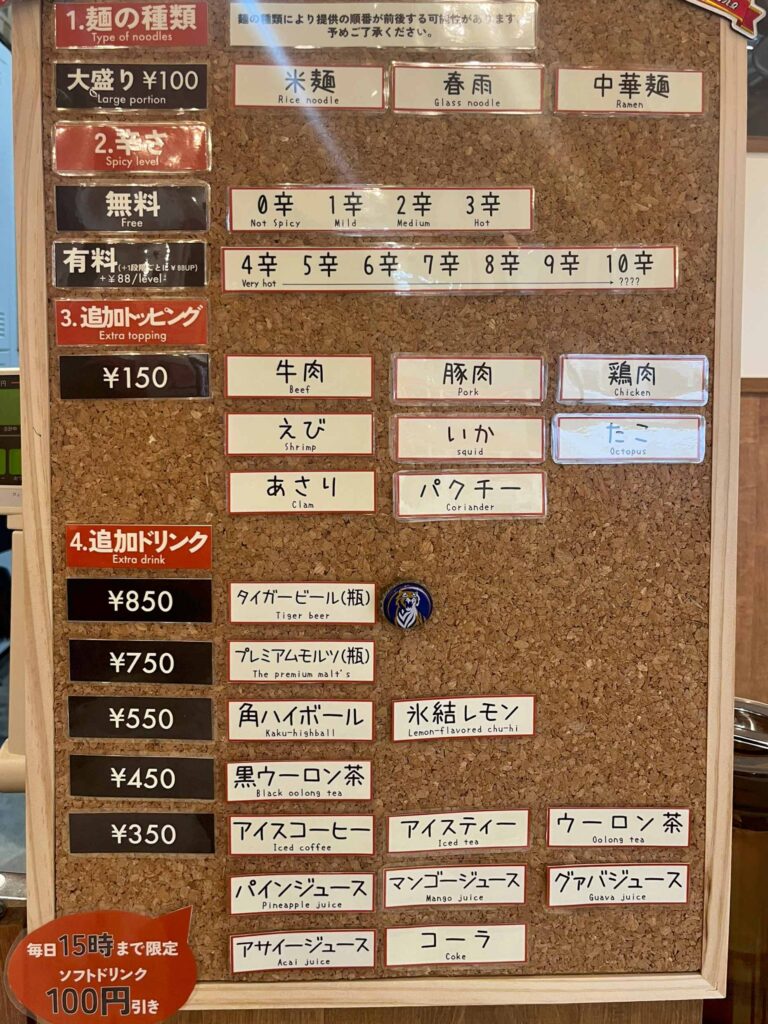 具材を取ったらレジへ。値段設定は、基本料金(麺+スープ)690円(税込)、それに選んだ具材1グラム毎に3.1円(税込)が追加されます。レジで、麺の種類、辛さ、追加トッピングの有無などを伝えてお会計です。