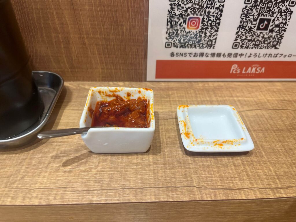 卓上には辛みを足せる調味料が用意されているので、辛さがもう少し欲しいという方はこちらを使うのもおすすめ。
