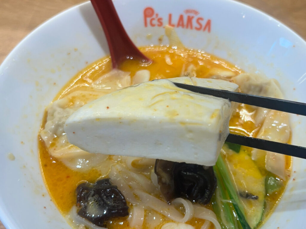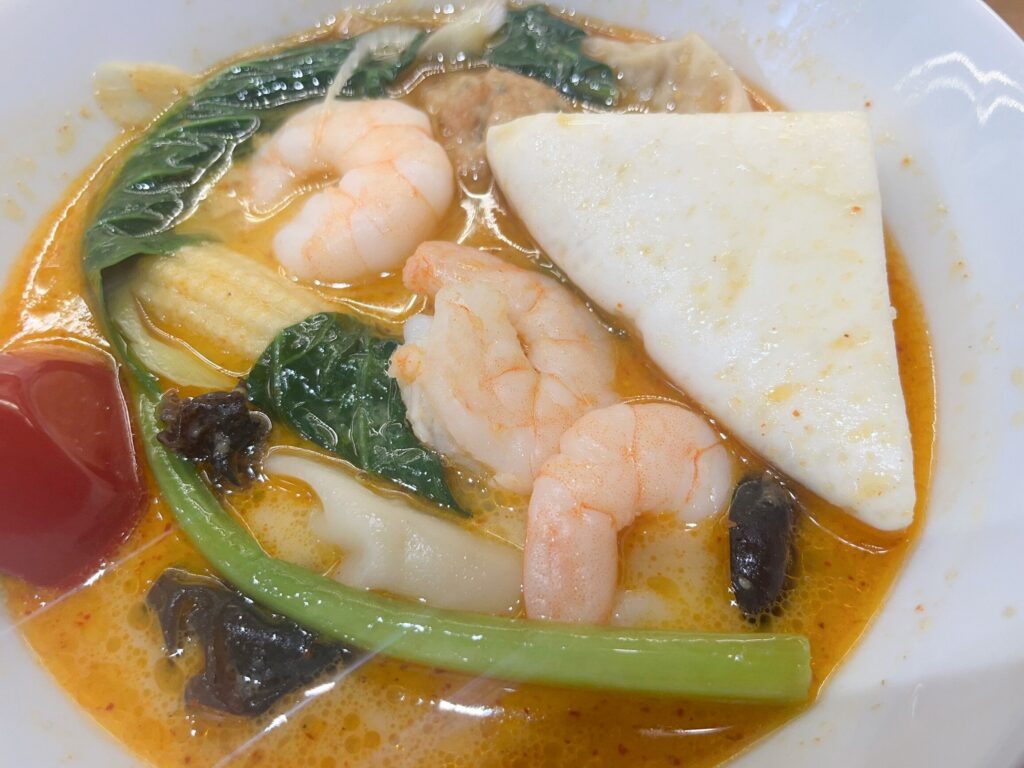 こちらが会計後5分も経たずに届いた『ラクサ』。麺は米麺、スープは2辛で注文。具材は、海老、キクラゲ、小松菜、えび団子、鶏団子、はんぺん、水餃子、ヤングコーン、ネギ、ワンタンをチョイスしました。お値段は1,286円(税込)!これだけの具材を入れてこの値段とは驚きです。