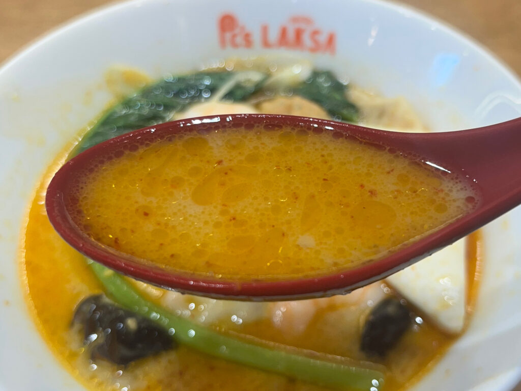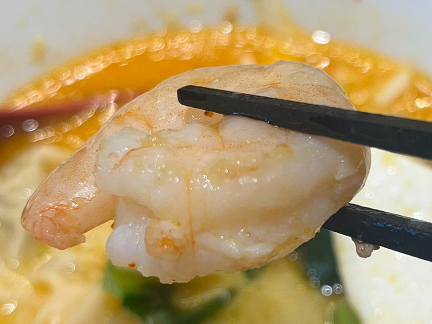 まずはスープから。ココナッツと海老の風味が漂います。飲んでみると、甘酸っぱいエスニックな味わいが広がりました。さっぱりしていながらも、魚介類のコクを感じ、ごくごく飲めちゃいそう。