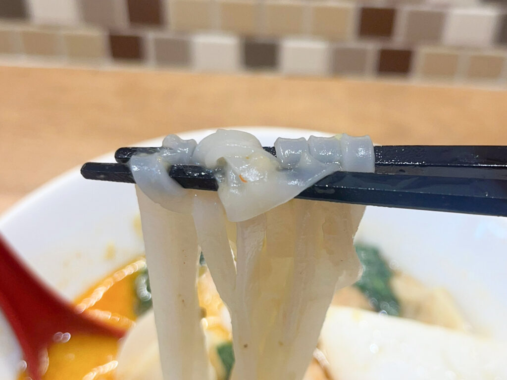 米麺はつるつると喉越しがよく、スープの風味とよく合います。