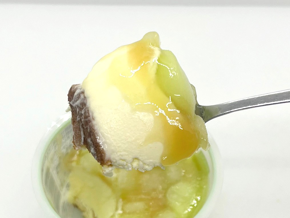 口の中に入れると、一気に鼻までマスカットの華やかな香りが突き抜けていきます。マスカットの豊かな味わいに加わるバニラアイス、白こしあんのコンビネーションが絶妙で、全体を上品で優雅な味わいに押し上げてくれました。さらに名脇役として大活躍するのがアロエの果肉とケーキ。アロエ特有のシャキシャキ食感が心地よく、バターのコクが美味しいケーキは、アイスに奥深さを与えてくれます。そしておもち!このもっちり感がたまらないんですよね。