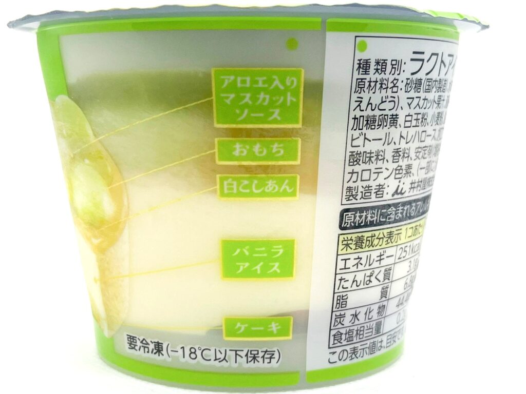 なんとこのアイス!5層構造なんです。中身の説明を見ると……白こしあん!?マスカット×白こしあんとは……どんな味になるんでしょうか?