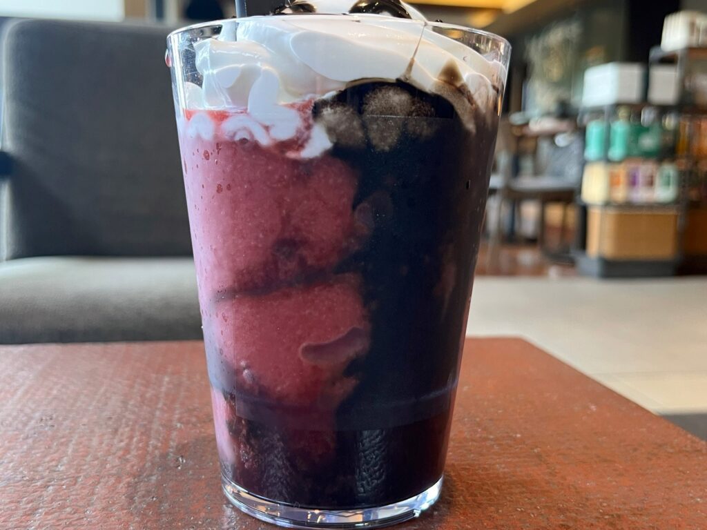 フレッシュな甘酸っぱさが口いっぱいに広がって、みずみずしいフルーティさが広がります。アサイーやベリー系のこっくりとした甘さを堪能。そこにチョコレートの奥深いコク、ホイップのまろやかさが徐々に加わり、マイルドな味わいに変化しました。時折入ってくるクランチのカリっとした食感も、サプライズみたいで楽しい!