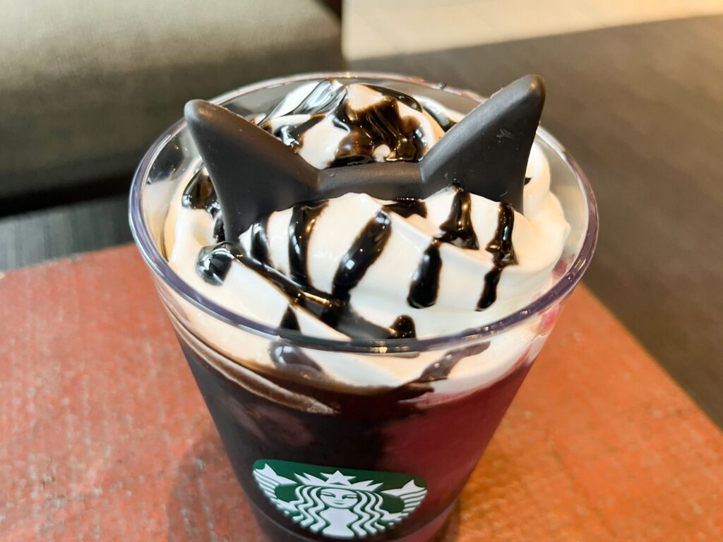 こちらがハロウィン新作の「アサイー ベリー フラペチーノ®」です。通称は「黒猫フラペチーノ®」。名前からすでに遊び心がたっぷり詰まっていて、キュート!