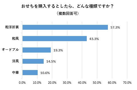 また内容としては、いろいろな味が楽しめる“和洋折衷”が1位、“和風”が2位にランクイン。正月は様々な年代の方が集まるので、子どもから大人までみんなで楽しめるタイプが人気を集めています。