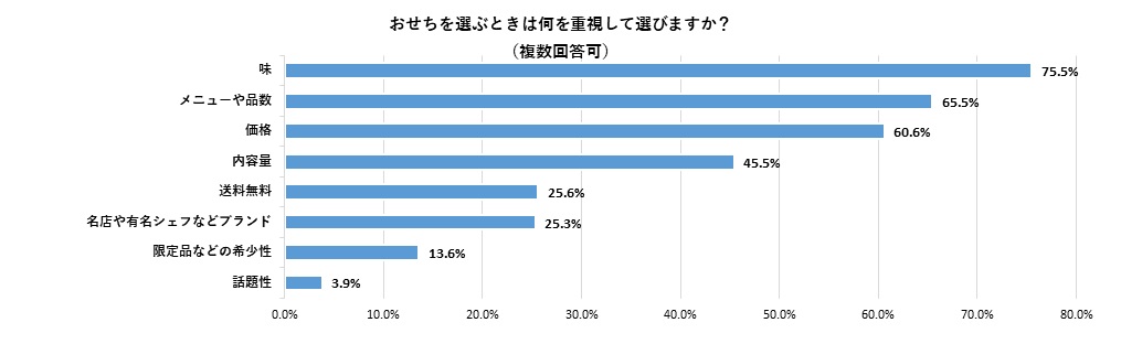 重視するものとしては、“味”が1位、“価格”は3位でした。せっかくのお正月、価格は二の次で、贅沢においしいものを食べたい!と考えている方も多いようですね。
