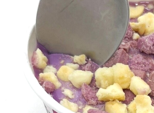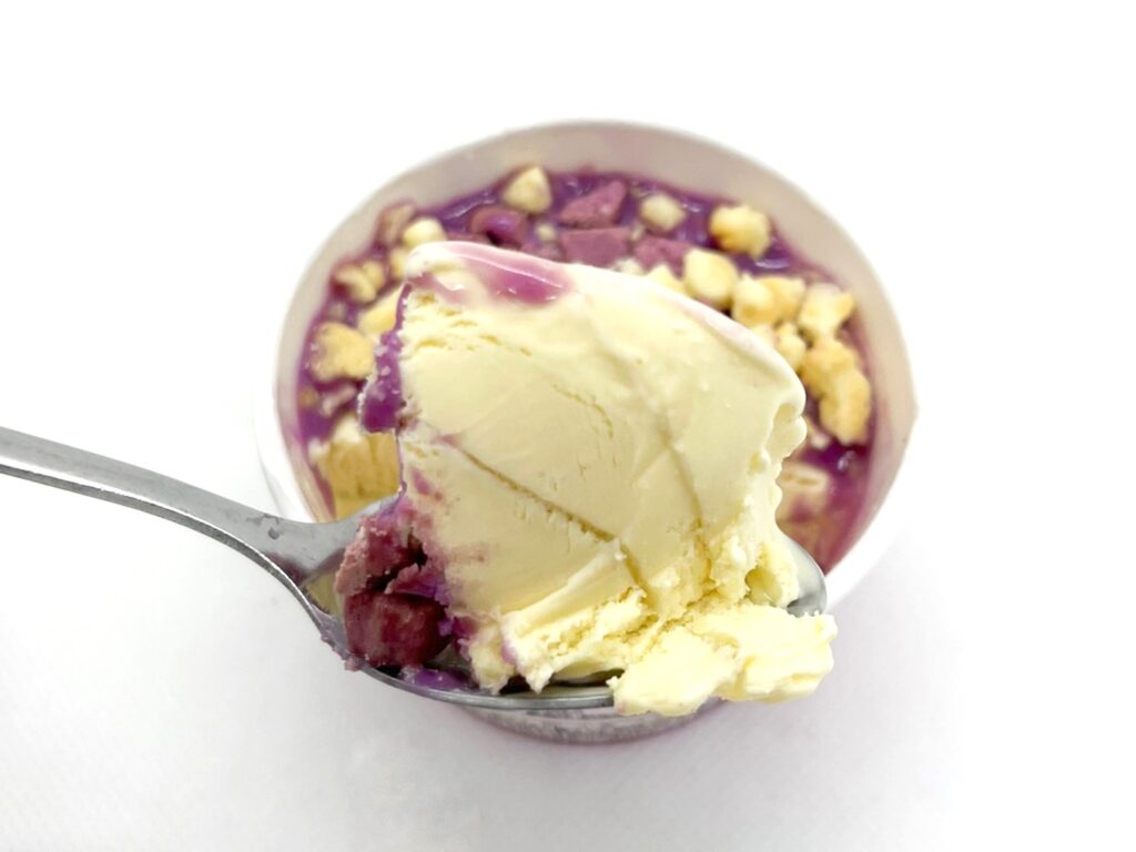 その下にあるのは、紫いもコーティング。スプーンを入れた時は硬そうでしたが、室温でどんどんとろけていきました。