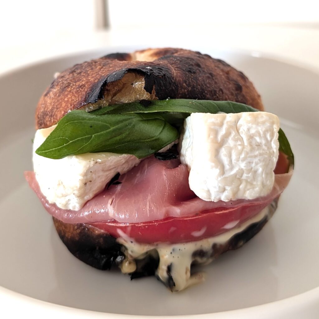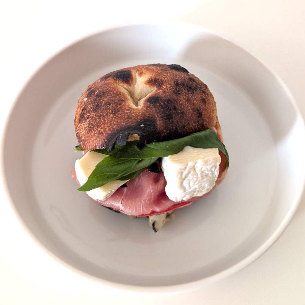 1つめは、横浜臨港パークの限定商品「ナポリサンド」(税込507円)。プロシュート(燻製していない生ハム)、カマンベール、バジルをサンドすることで、イタリア感が詰まったパン。ピザ窯で生地を焼き上げている「ナポリシリーズ」の新作です。見た目はパンなのに、一口食べるとふわっとピザ生地の香り。ゴロンと大きいカマンベールと、程よい塩味のプロシュートのバランスが良く、パンではなく、まるで本物のピザを食べているような後味。見た目は小さめですが、食べごたえのある惣菜パンです。