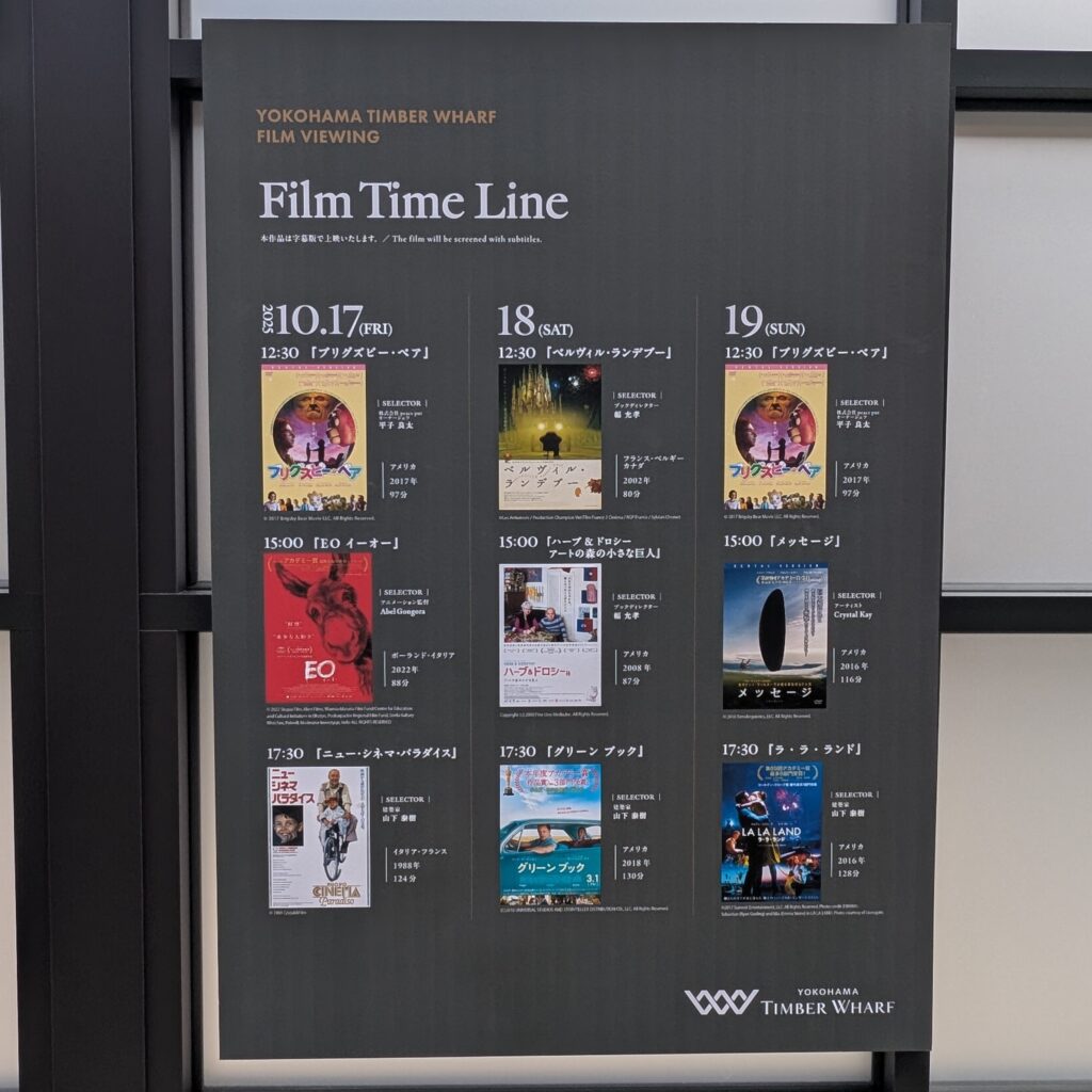 10月17日〜19日の3日間には、『横浜ティンバーワーフ』の開業記念イベントとして、無料のフィルムビューイングも臨港パーク内で開催されました。建物を手掛けた建築家・山下泰樹さんのほか、アートやカルチャーを牽引するクリエイティブな方々が選んだ作品が上映されました。私が大好きな作品「ベルヴィル・ランデブー」がこの機会に観られると知り、足を運ぶことに。海辺の心地よい風に包まれながら、好きな場所でのんびり過ごすことで、映画館で観るのとはまた違った開放感あふれる体験ができました。今後もこのようなイベントの開催を期待しています。