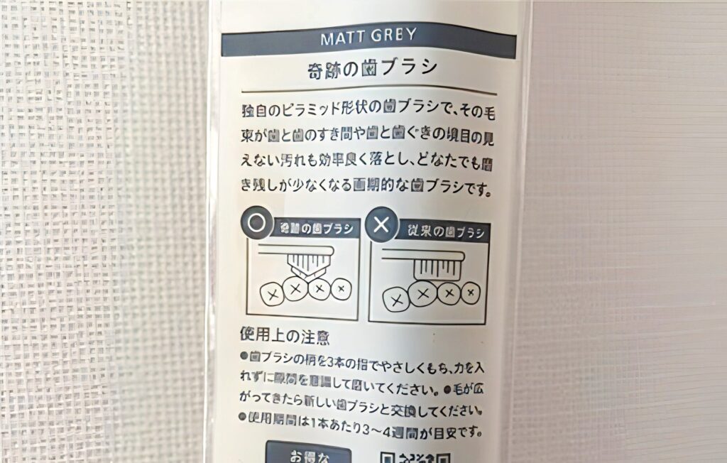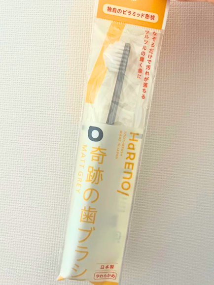 もうひとつは、以前から気になっていた「奇跡の歯ブラシ」というキャッチコピーの『HaRENO(ハレノ)』。見た目からしてユニークなピラミッド形状が特徴です。