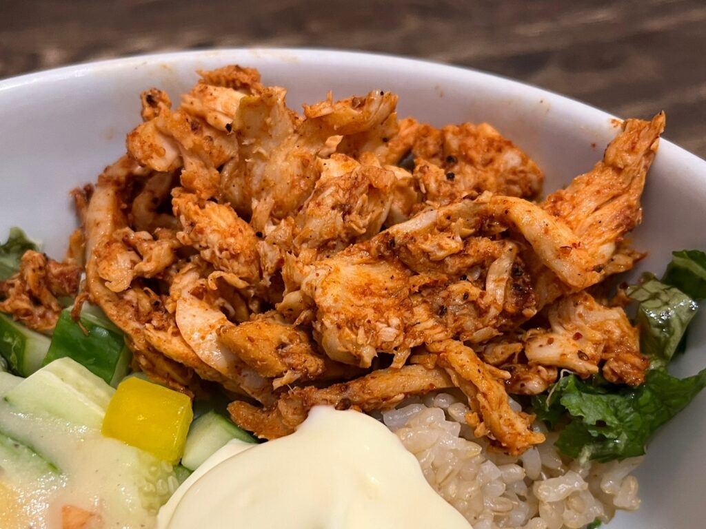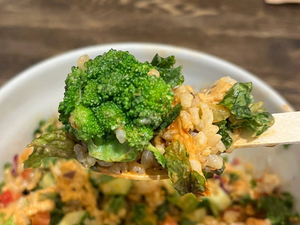ではさっそくいただきます。フレッシュな野菜は塩こうじドレッシングで味付けされていて、シャキシャキした食感と塩味のバランスが最高!そこにもちもちプチプチの玄米の食感や蒸し鶏のスパイシーさがいいアクセントになっていて、どんどん進んでしまいました。噛み応えがある食材が多いので、満足感が高く、完食するころにはすっかり満腹。でもこれで544キロカロリー。栄養もばっちり取れる嬉しい一品です。