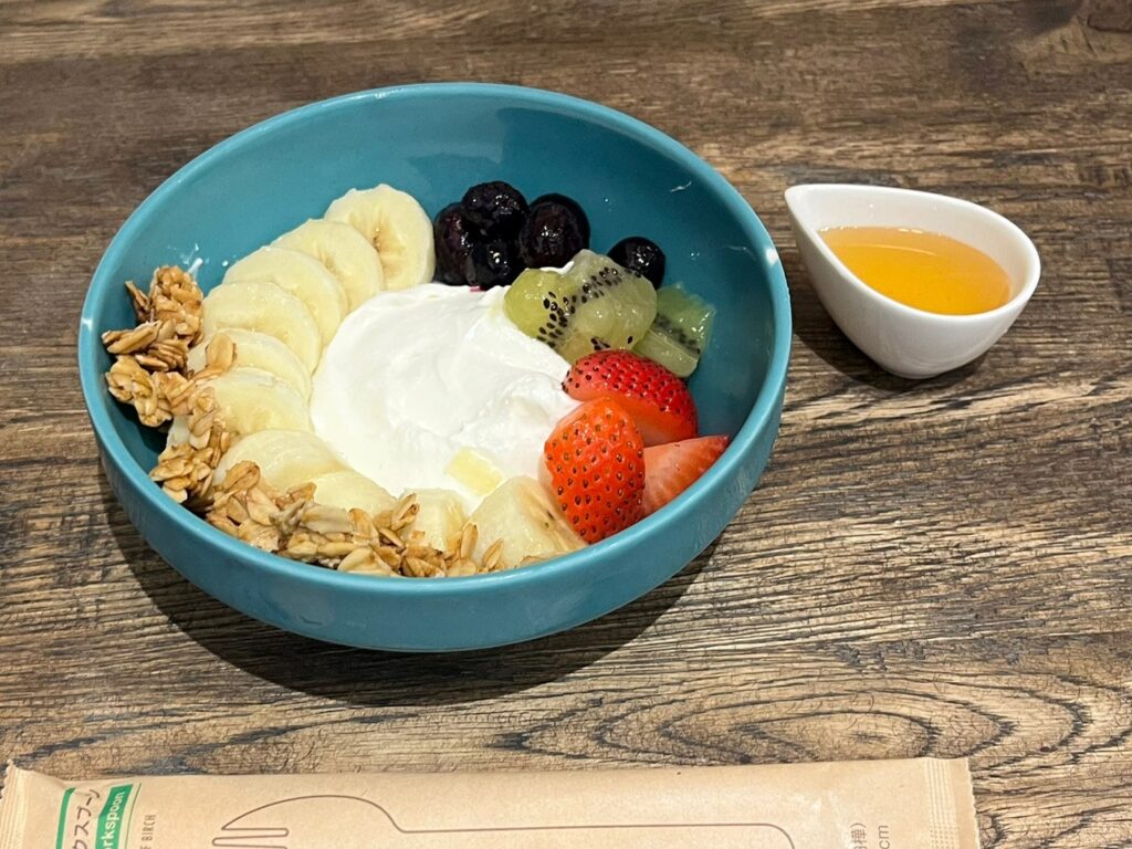 メニューを見てどうしても食べたくなった『フレッシュフルーツたっぷりのグリークヨーグルトボウル』(税込1,100円)も注文。こちらは、高タンパク質・低カロリー・腹持ちが良い・腸内環境の改善・筋肉の維持など、魅力満載のデザートです。