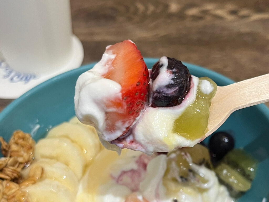 濃厚なヨーグルトの酸味に、甘酸っぱいフレッシュなフルーツ、香ばしいグラノーラ、コク深い甘さのハチミツが混ざり合い、これ一つでランチになってしまうんじゃないかというリッチさ。もうちょっと何か食べたいという時にヘルシーにいただけるのもポイントです。
