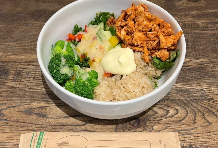 ではさっそくいただきます。フレッシュな野菜は塩こうじドレッシングで味付けされていて、シャキシャキした食感と塩味のバランスが最高!そこにもちもちプチプチの玄米の食感や蒸し鶏のスパイシーさがいいアクセントになっていて、どんどん進んでしまいました。噛み応えがある食材が多いので、満足感が高く、完食するころにはすっかり満腹。でもこれで544キロカロリー。栄養もばっちり取れる嬉しい一品です。