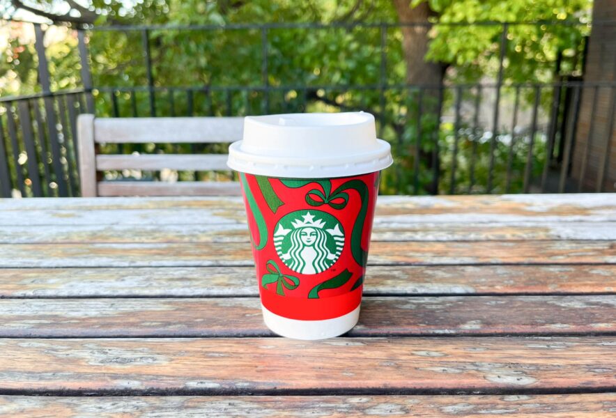 こちらが新作、ふわふわなカプチーノのように仕立てられたスープ「トリュフ スープチーノ」です。展開はShortサイズのみ。テイクアウトは税込491円、イートインは税込500円となっています。クリスマスカラーのカップが素敵♪