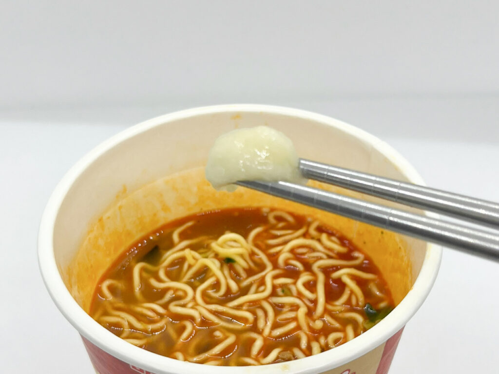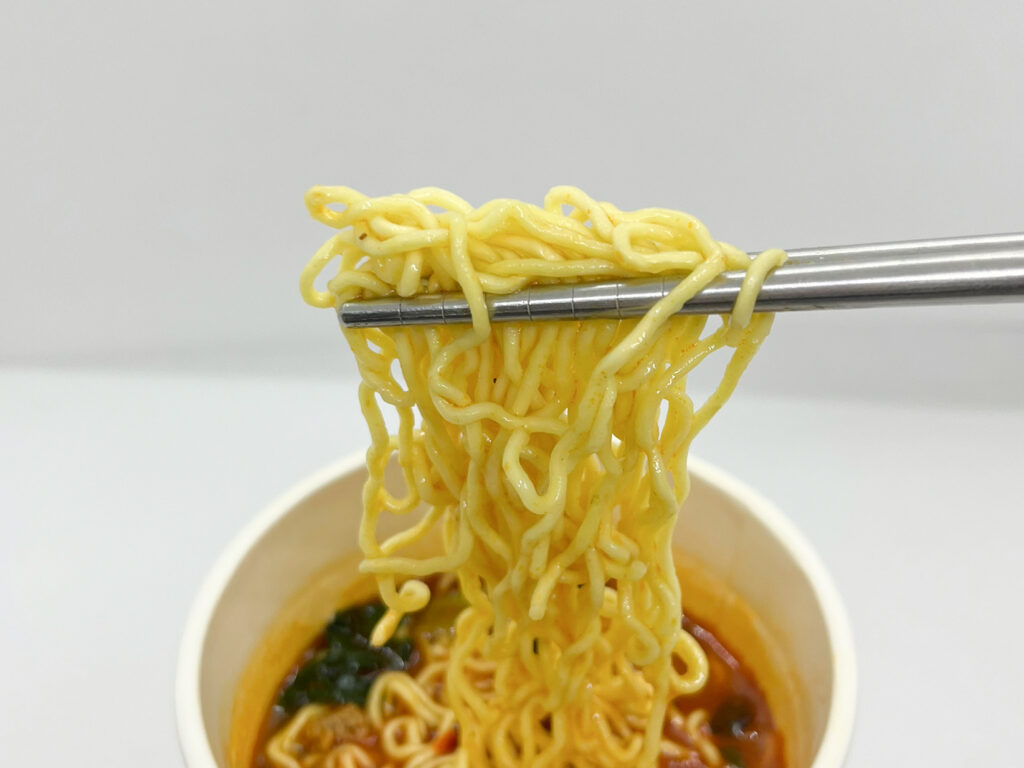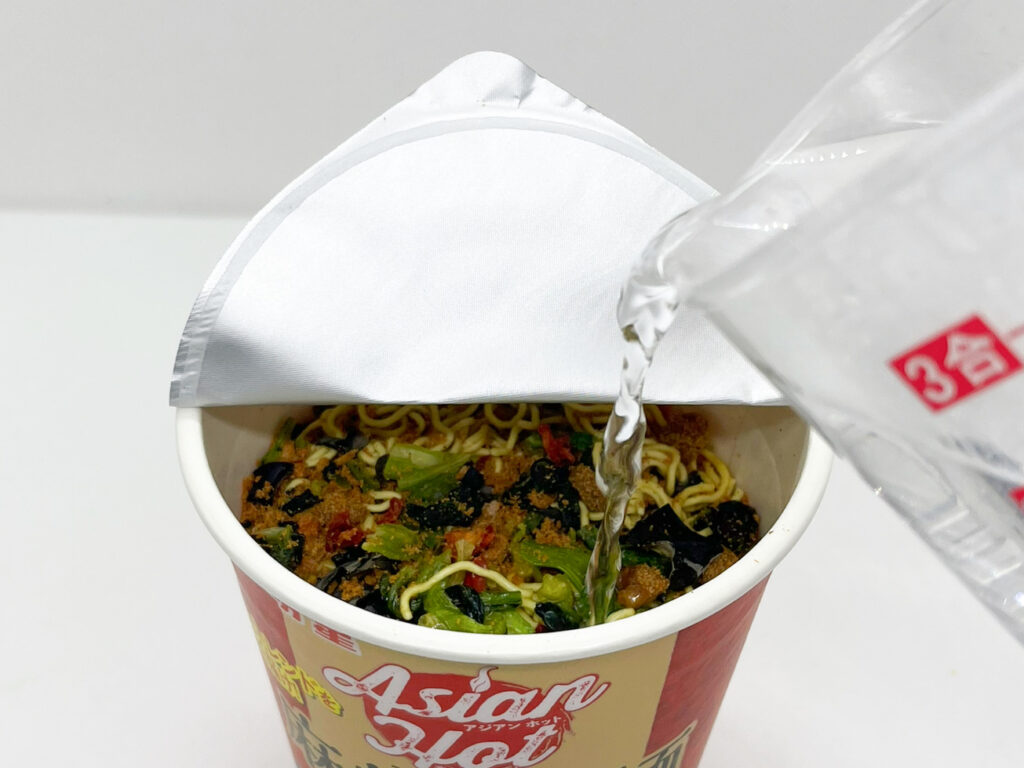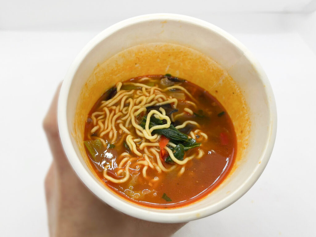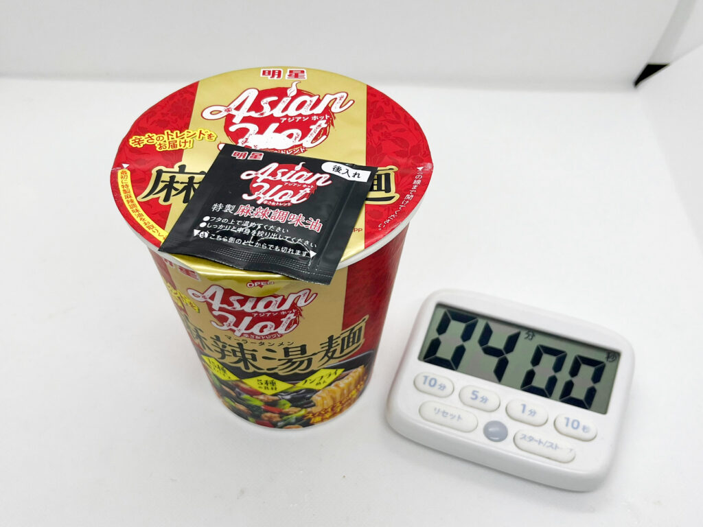 表記通り、お湯をカップ内側の線まで入れ、4分待ちます。待っている間も辛そうな香りが漂ってきて、食欲が刺激されちゃう!