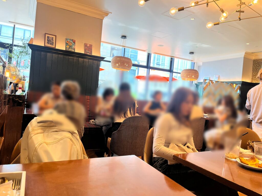 訪問したのは平日のランチタイムを少し過ぎた頃でしたが、多くの人で賑わっていました。席がたくさん並んでいますが、店内が広いので混みあっていても開放感があり、1人で訪れてもゆっくりと過ごすことができます。