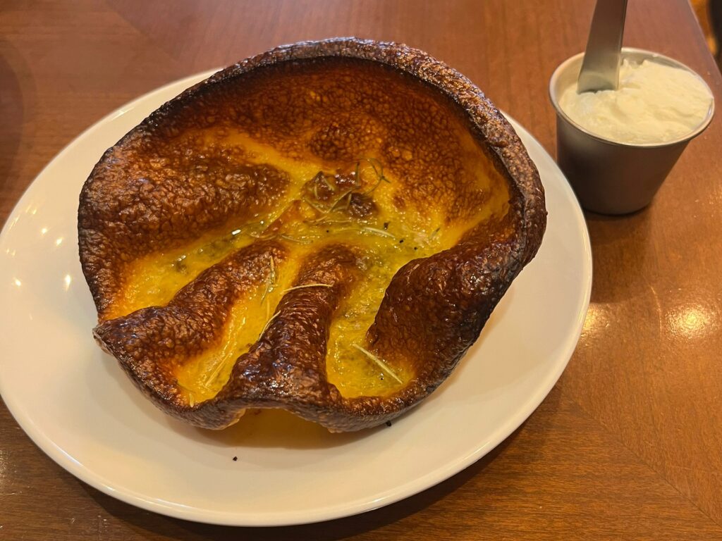 おかわり自由が魅力のポップオーバーは香ばしく焼かれたカリっとタイプ。ローズマリーが振りかけられていました。