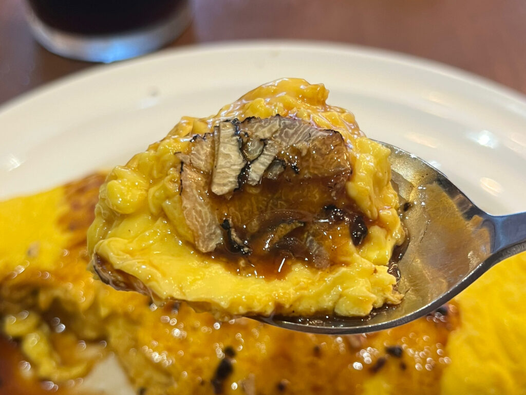 オムレツは驚くほどふんわり柔らかでとろとろ。まさに“完璧なオムレツ”!口に入れた途端、ホロっととろけていきます。卵のコクとトリュフの芳醇な香りのハーモニーがたまりません。そこに濃厚なデミソースが加わり、極上の味わいをさらに深めていました。
