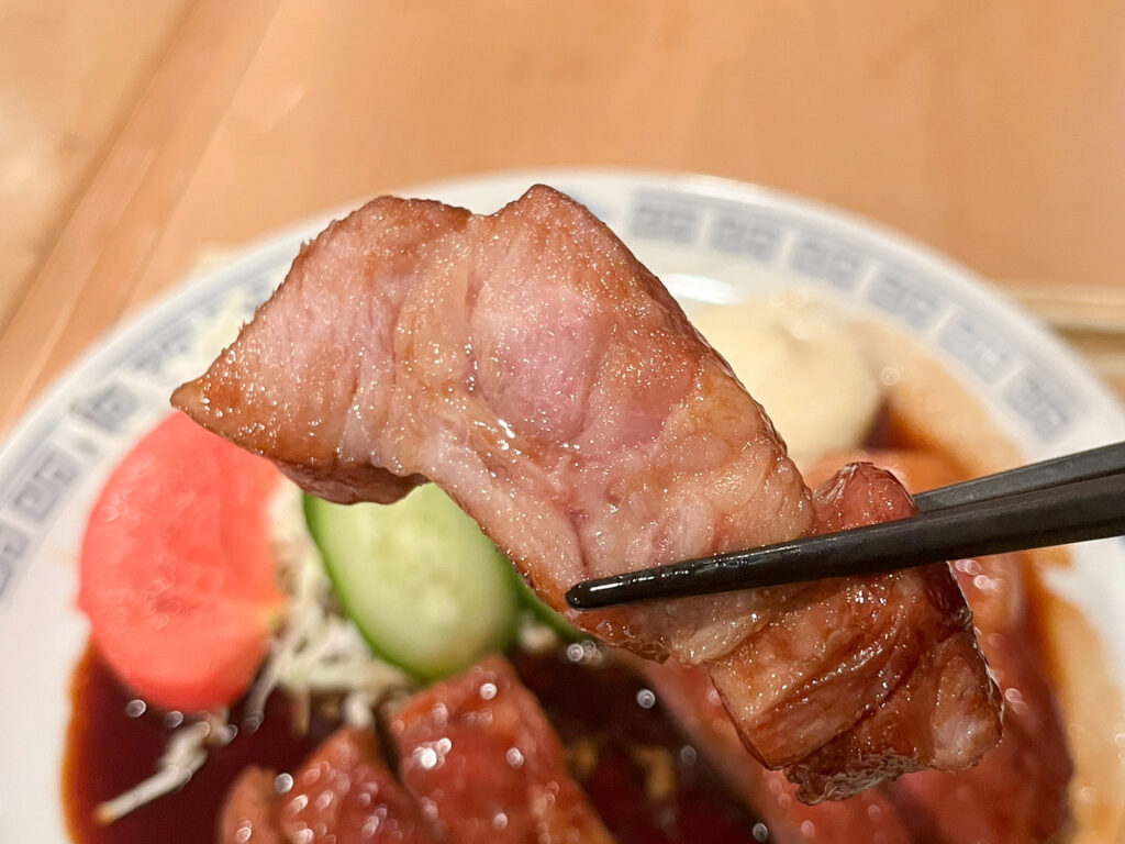 さっそく一切れ持ち上げてみると、この分厚さ。店主であるとみさんが、お客さんを笑顔にしたいと、どんどん分厚くなったんだそう。かじってみると豚肉の旨みと甘みがじゅわっと染みだし、口いっぱいに広がります。肉の食感をしっかり感じる噛み応えですが、硬さはありません。脂身もとてもジューシー。またそこに絡む甘辛で濃厚な醤油ベースのタレが、さらに食欲を刺激します。これはもうご飯泥棒!