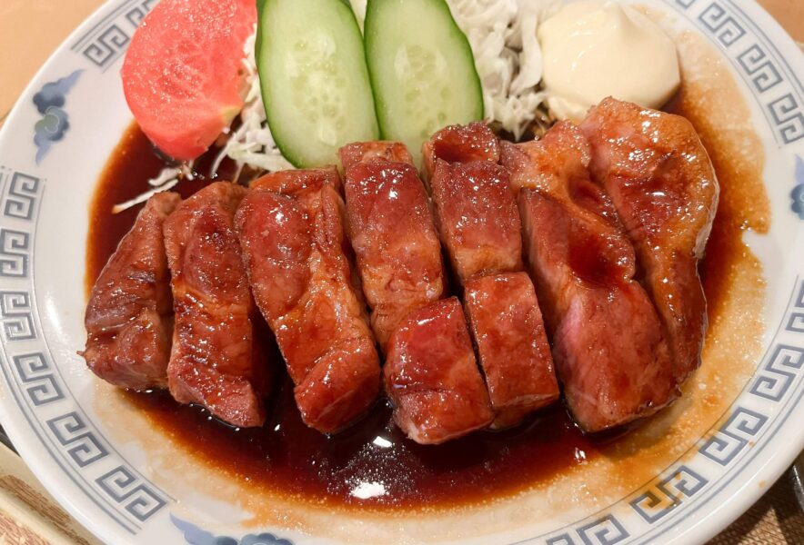 さっそく一切れ持ち上げてみると、この分厚さ。店主であるとみさんが、お客さんを笑顔にしたいと、どんどん分厚くなったんだそう。かじってみると豚肉の旨みと甘みがじゅわっと染みだし、口いっぱいに広がります。肉の食感をしっかり感じる噛み応えですが、硬さはありません。脂身もとてもジューシー。またそこに絡む甘辛で濃厚な醤油ベースのタレが、さらに食欲を刺激します。これはもうご飯泥棒!