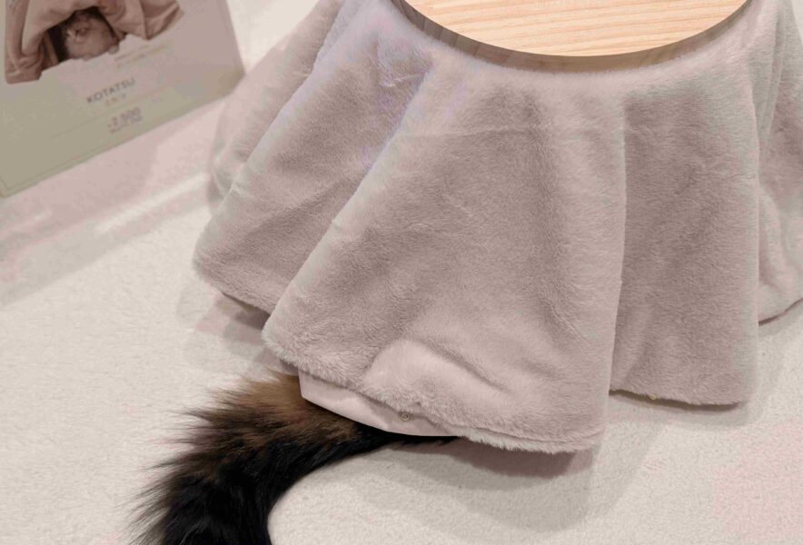 小型のこたつから、モフモフの尻尾が飛び出しています!その姿の可愛らしいことったら。思わず尻尾を撫でたくなっちゃいますね。