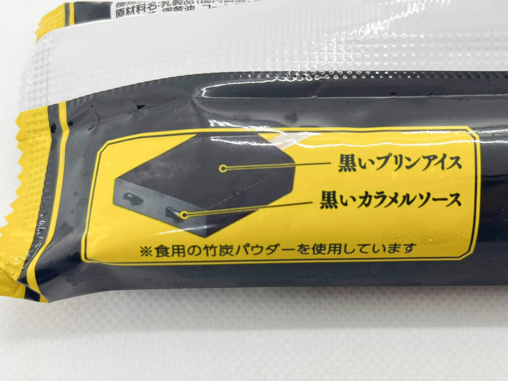 こちらがローソンでゲットしてきた「黒いプリンアイス」。税込227円です。色とりどりのアイスが並ぶ中、真っ黒なパッケージは逆に異彩を放っていました。