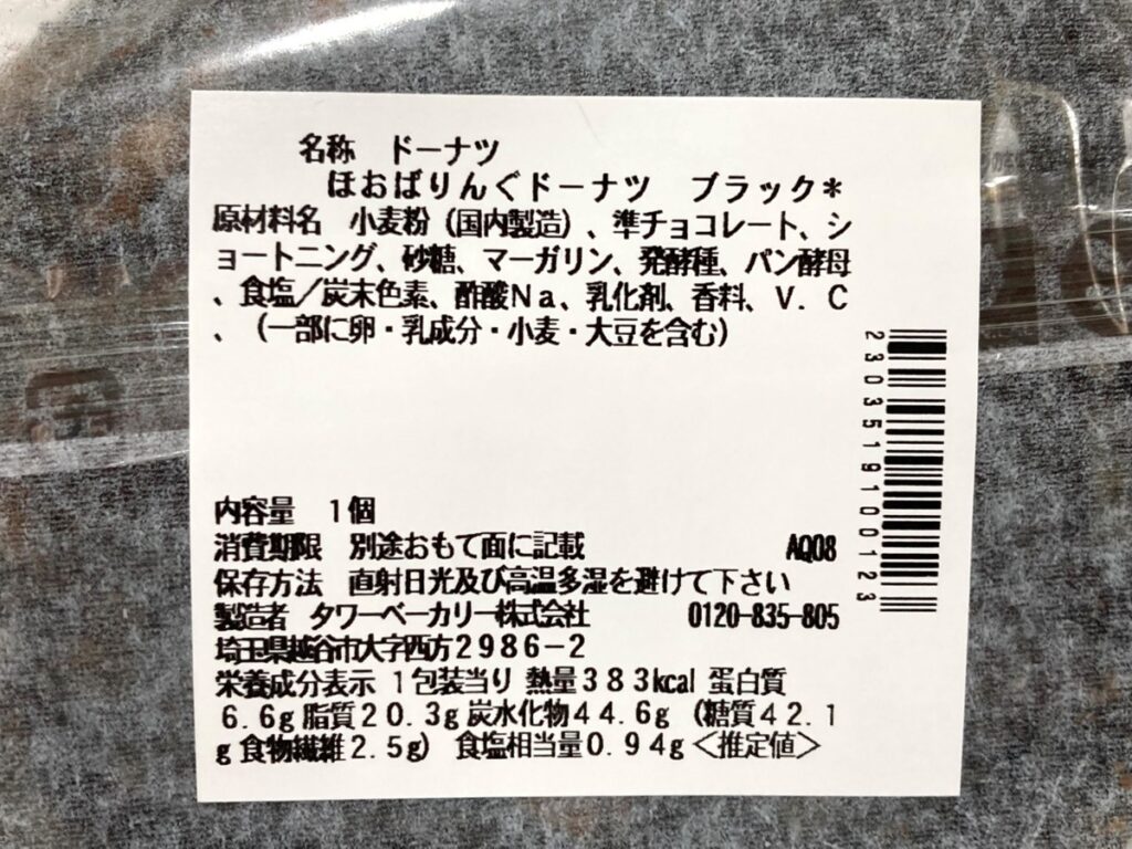 お次は「ほおばりんぐドーナツ ブラック」(税込181円)。1個当たりの熱量は383kcalです。