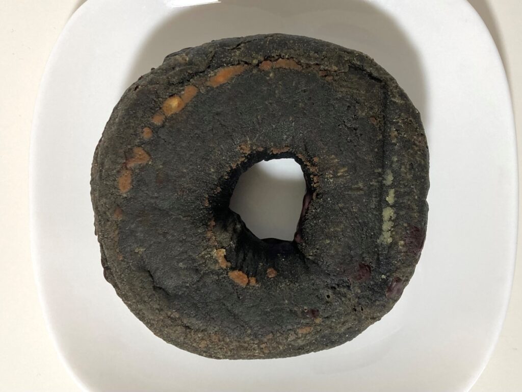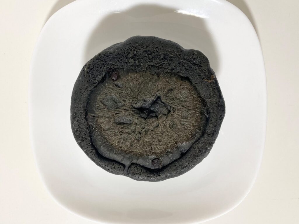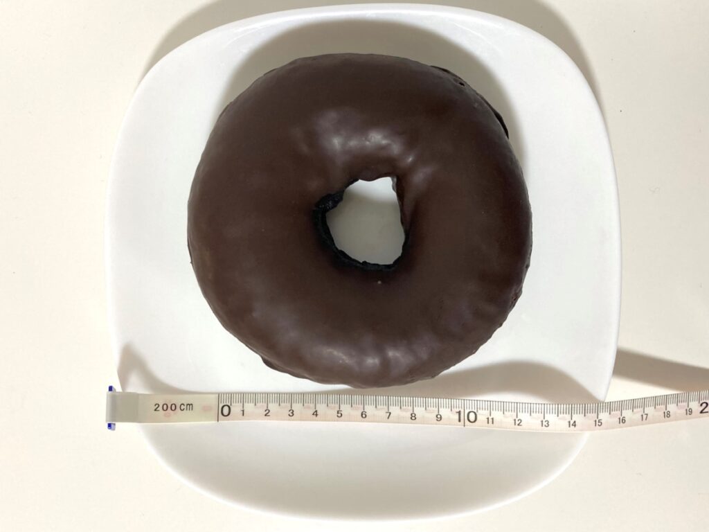 黒色の生地にチョコレートがかけられた黒づくしのドーナツは、黒いだけではなく大きい!計ってみると直径は12cm。持った時のボリューム感がすごいです。こちらも裏返してみると、真っ黒だ~。