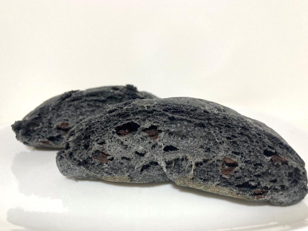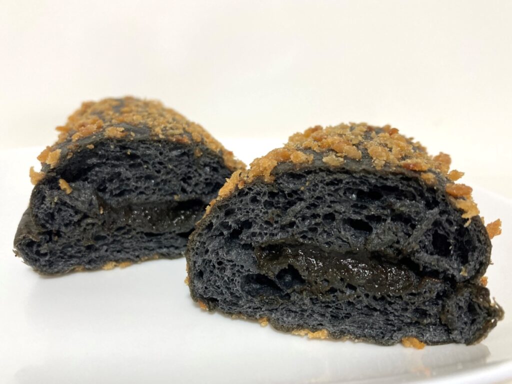 断面をチェック。なんと中のカレーフィリングも真っ黒です!本当にカレーなのか?と疑いつつ、しっかり美味しそうなカレーの香りがしています。