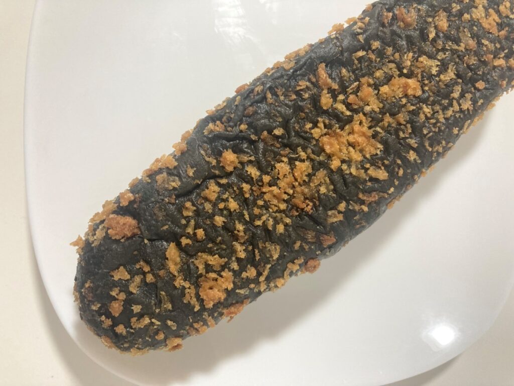 黒い生地に、鮮やかなオレンジ色のパン粉がまぶされているという、驚きの見た目!こちらは裏返しても全く同じ色でした。近寄ってみるとより何か分からない見た目がじわじわと面白いです。