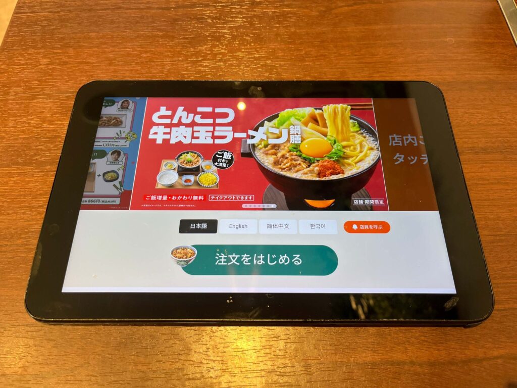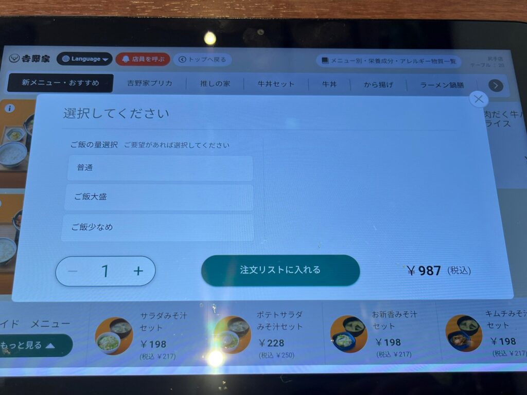注文はタブレットから。ここで気になる文面を発見。“ご飯増量・おかわり無料”!?お米が高いご時世、嬉しいサービスです。