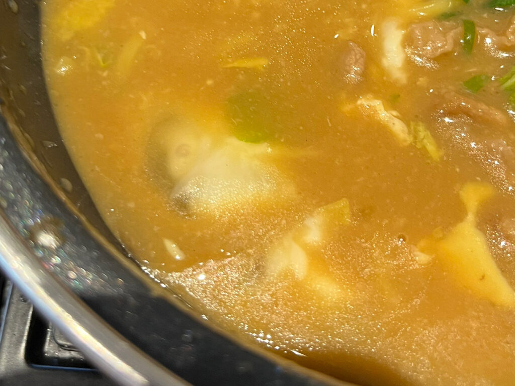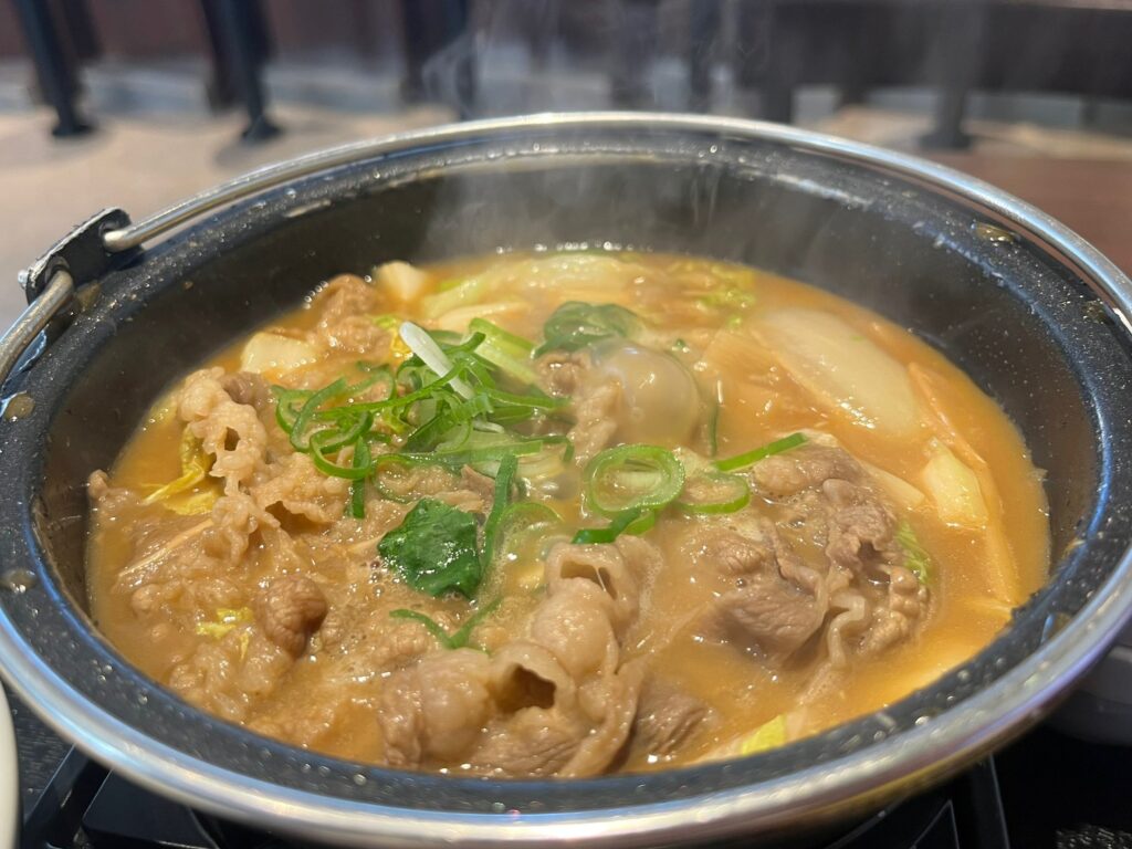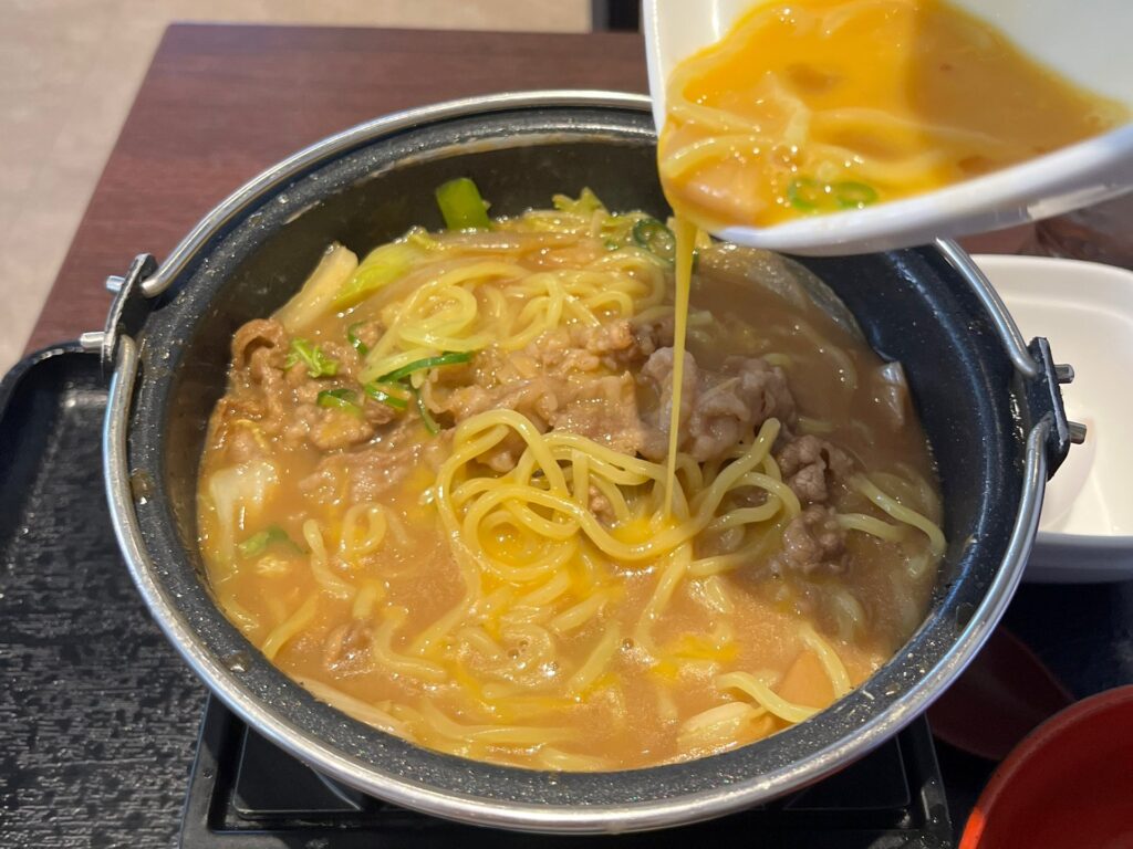 鍋は火にかけられ、ぐつぐつと湯気が立ち上っています。とんこつラーメンらしくもあり、牛丼らしさもある香りが漂い、食欲が刺激されます。