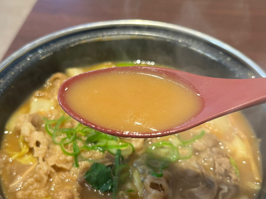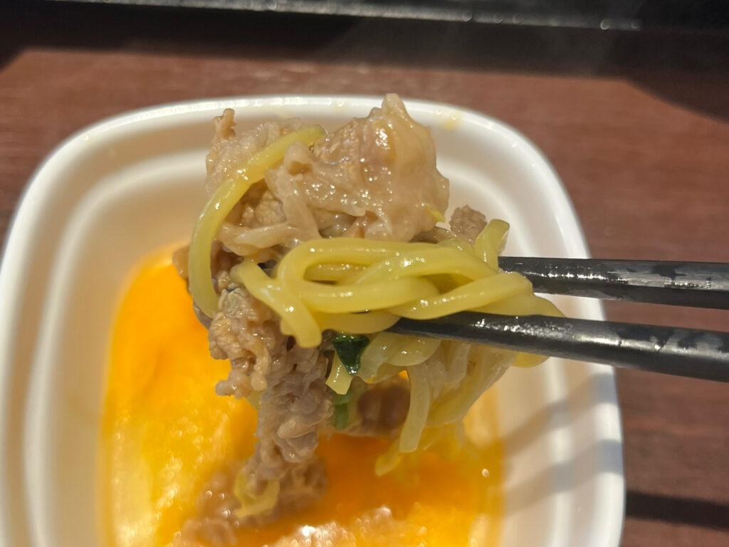 生卵が付いてきたので、そちらですき焼き風も楽しめます。卵で濃厚な味わいがマイルドになるだけでなく、卵の旨みがスープのコクを引き立てていました。