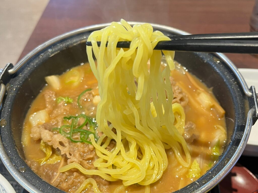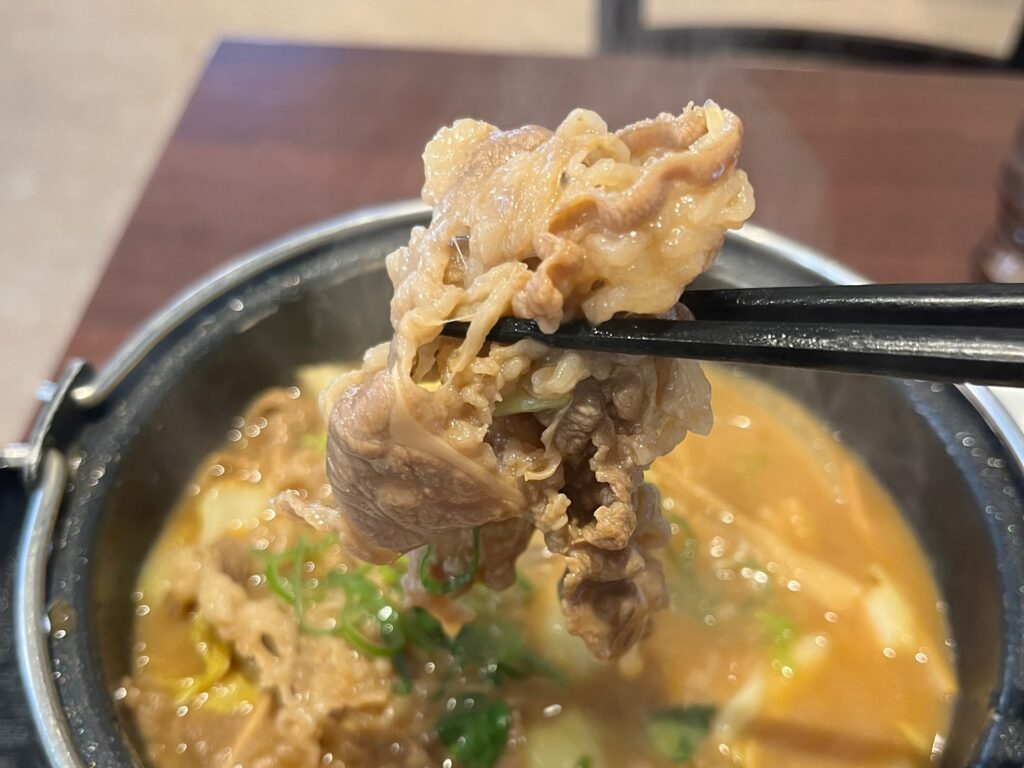 鍋の中には大ぶりの牛肉がいっぱい。白菜や玉ねぎ、メンマなどの野菜もたっぷり入っていて、具だくさんな鍋です。