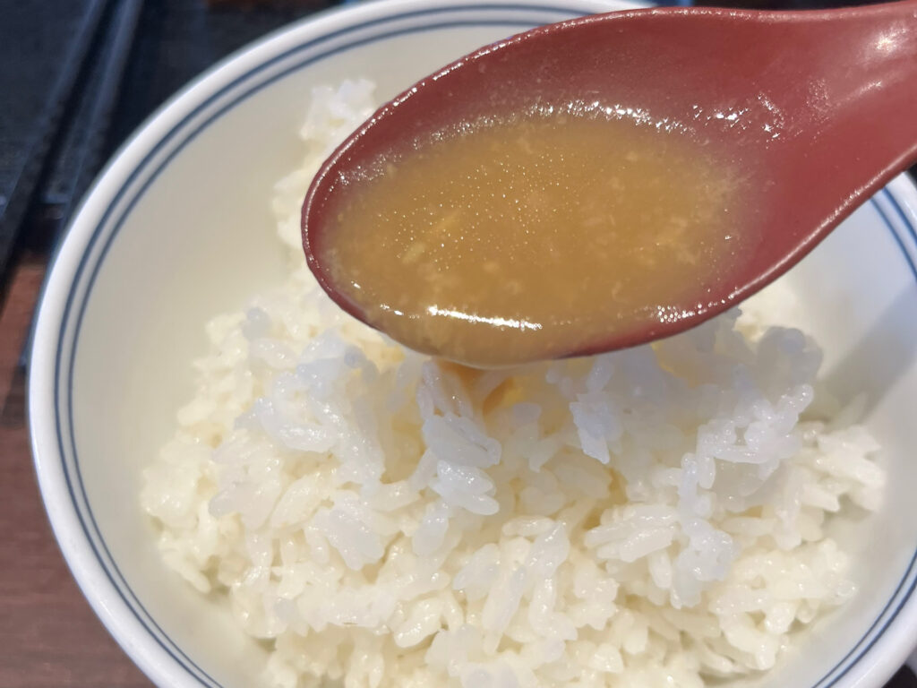 濃厚な味わいにご飯がどんどん進んでしまい、大盛ご飯があっという間に消えてしまいました。ついつい普通盛りをおかわり。今度はスープをご飯へ投入。これもまた大正解!ご飯にスープの旨みがよくしみ込んで、さらに箸が止まりません。気づいたらおかわりしたご飯も完食してしまいました。