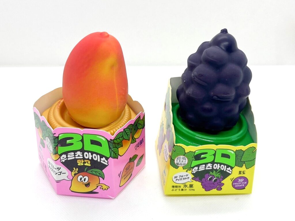 こちらが『3Dフルーツアイスマンゴー』と『3Dフルーツアイスブドウ』です。私は近所のセブン-イレブンで購入しました。1つ498円(税抜)です。まずこの見た目にくぎ付け!ものすごく立体的じゃないですか?
