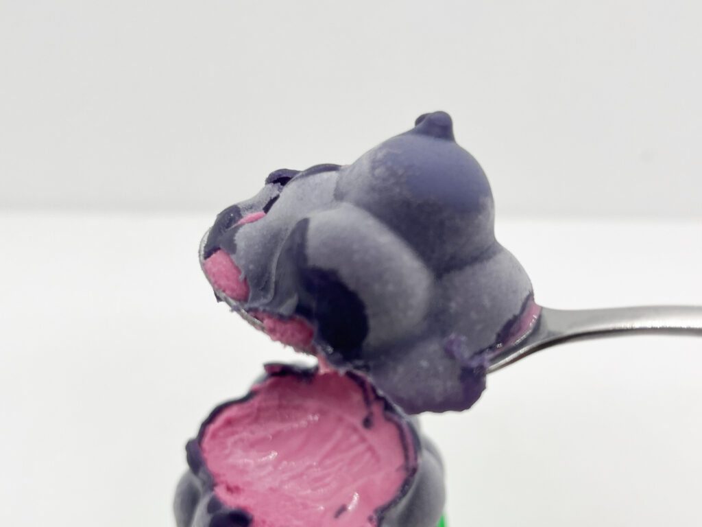 今回はまず一旦、スプーンですくっていただきます。外側はコーティングがされているようで、パリっと割れると、中からキレイな色のアイスが出てきました。