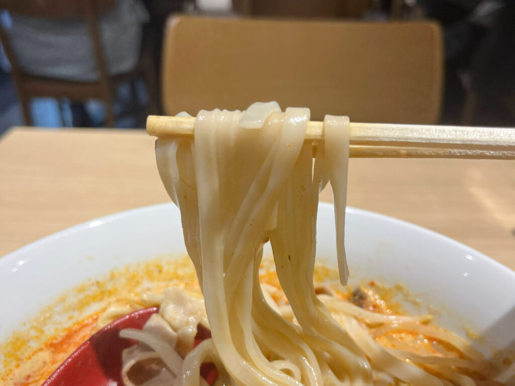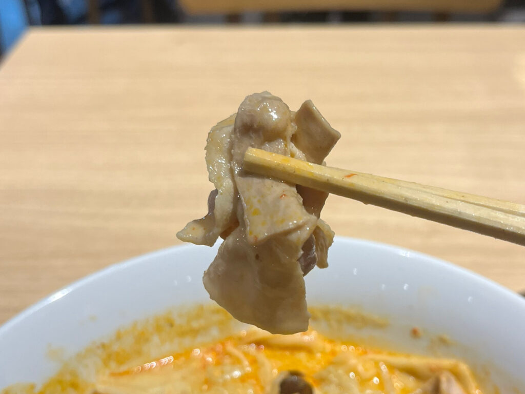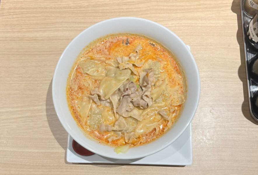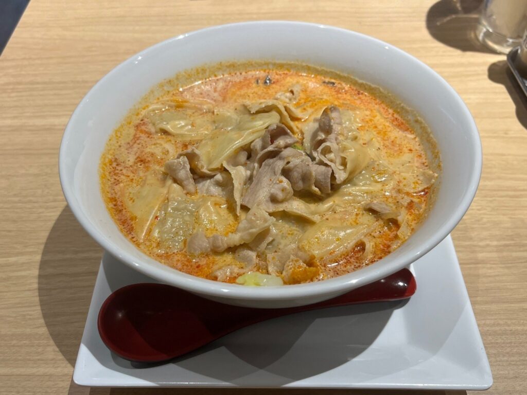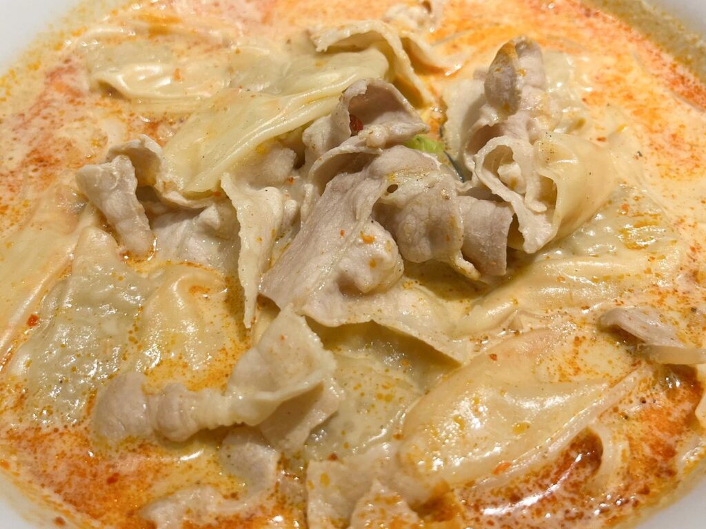 見た目ではわかりませんでしたが、野菜もたっぷりでした。白菜やもやしが器の底からどんどん出てきて、シャキシャキした野菜の食感とスープの相性も最高。ワンタンや豚バラ肉もよく合うのですが、野菜をとても美味しくいただけて、まるでピリ辛豆乳鍋を食べているような感覚を楽しめました。