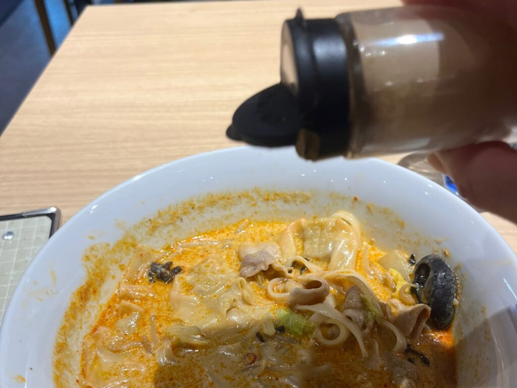 また卓上にある調味料で味変も。私は大好きな“花椒”を追加。華やかな痺れる辛みがマイルドなコクに加わり、また一味違った旨みを感じます。