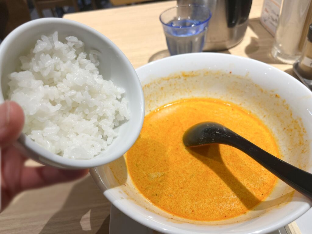 そして嬉しいのが、追い飯のサービス。メニューでは有料となっていますが、現在はなんと、期間限定で小ライスが無料サービス中なんだとか(期間は決まっていないそうです)。麺を堪能したら、店員さんに「追い飯お願いします!」と声をかけると、ご飯を持ってきてくれました。スープにご飯を入れることによって、余すことなくスープの旨みを堪能できますよ。