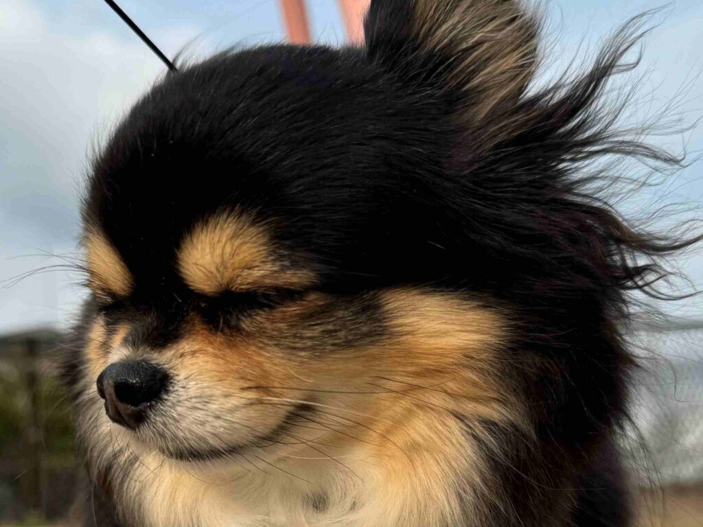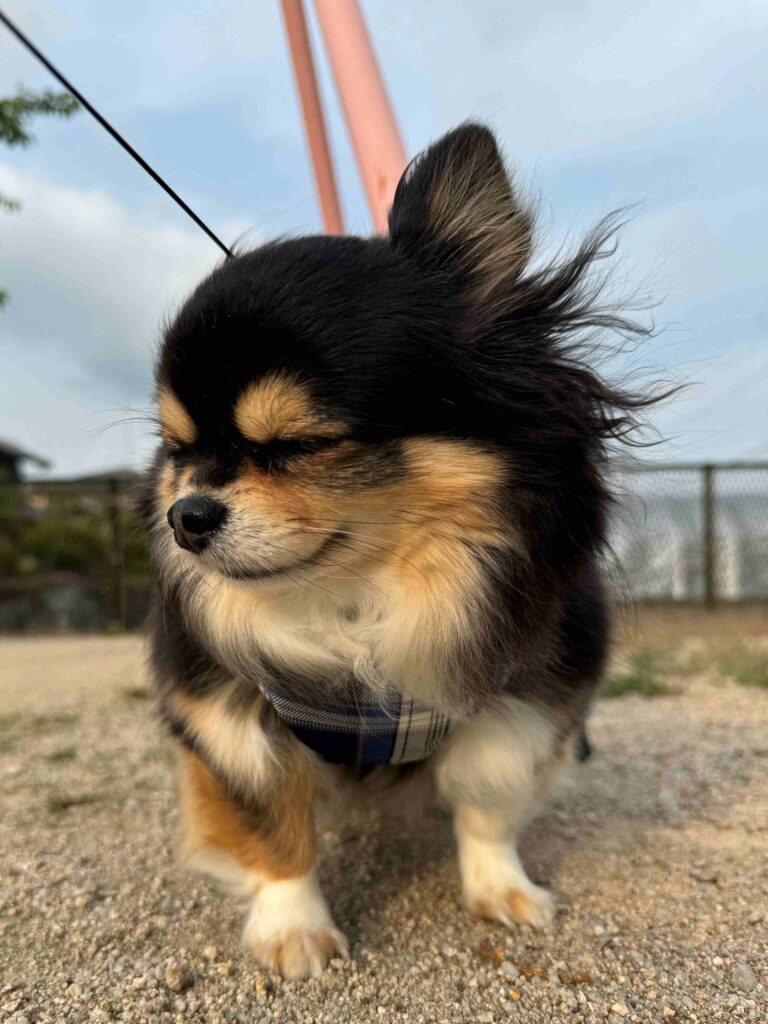 「疲れて歩きたくないのと、風邪が吹いたのとでこの顔になりました(笑)」と、その時のことを飼い主さんが教えてくださいました。なるほど!「もう疲れたよ~」という感情も入っていたんですね(笑)。