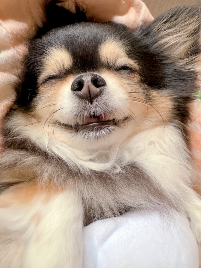 いまでは、ヘソ天(ワンちゃんやネコちゃんがお腹を上にして仰向けで寝そべっている状態。安心・信頼・リラックスの証拠)する姿を見せるほど!