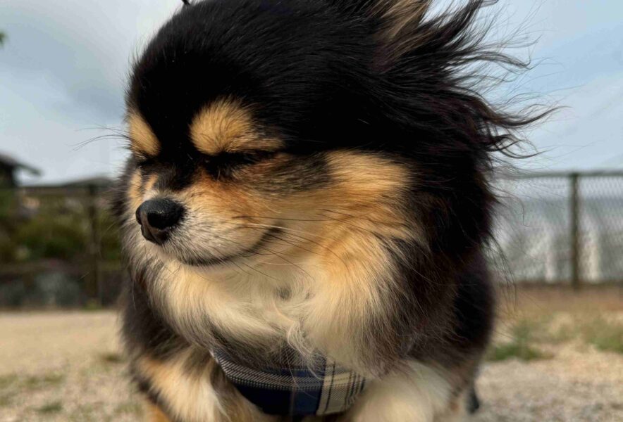 「疲れて歩きたくないのと、風邪が吹いたのとでこの顔になりました(笑)」と、その時のことを飼い主さんが教えてくださいました。なるほど!「もう疲れたよ~」という感情も入っていたんですね(笑)。